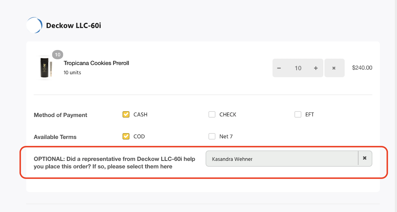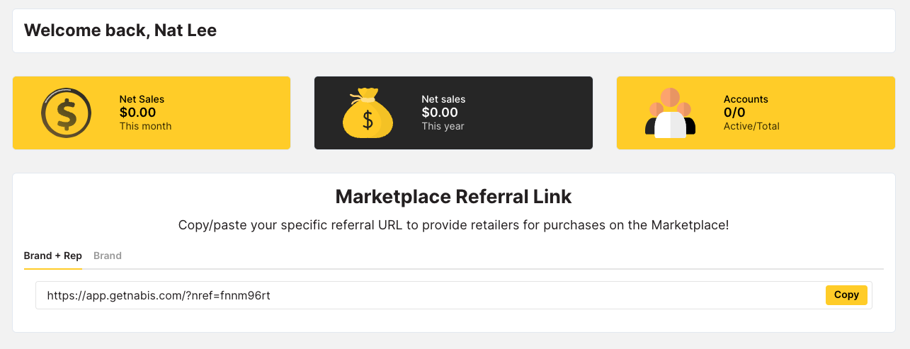 On the Home Page on Nabis, each Brand user will have a unique ‘Brand + Rep’ link, which takes the Retailer, after sign-in, directly to your page on the Marketplace. With the Brand + Rep link, that specific rep is auto-populated in the Checkout page in the field where it attributes a referral (which can be altered by the Retailer at checkout as well as by Brand Admins on the Orders Page on Nabis after the Marketplace order has been submitted.