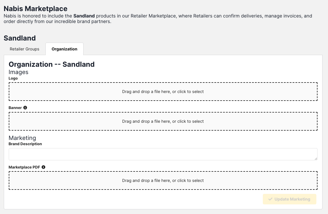 Brands can upload a banner and logo to be displayed on your Marketplace. You’ll also be able to update other marketing assets (Brand Description & Marketplace PDF). These assets can be switched out at any time. (Sales tab → Marketplace dropdown → Organization tab)