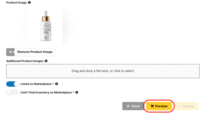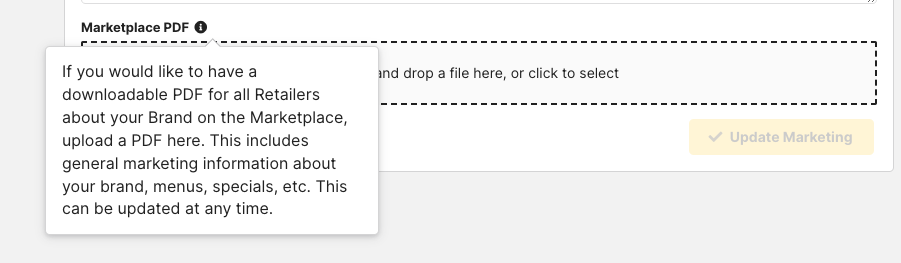 Brands on the Marketplace can upload a PDF sales sheet downloadable by the Retailers. Max file size is 9.54MB. (Sales tab → Marketplace dropdown → Organization tab)