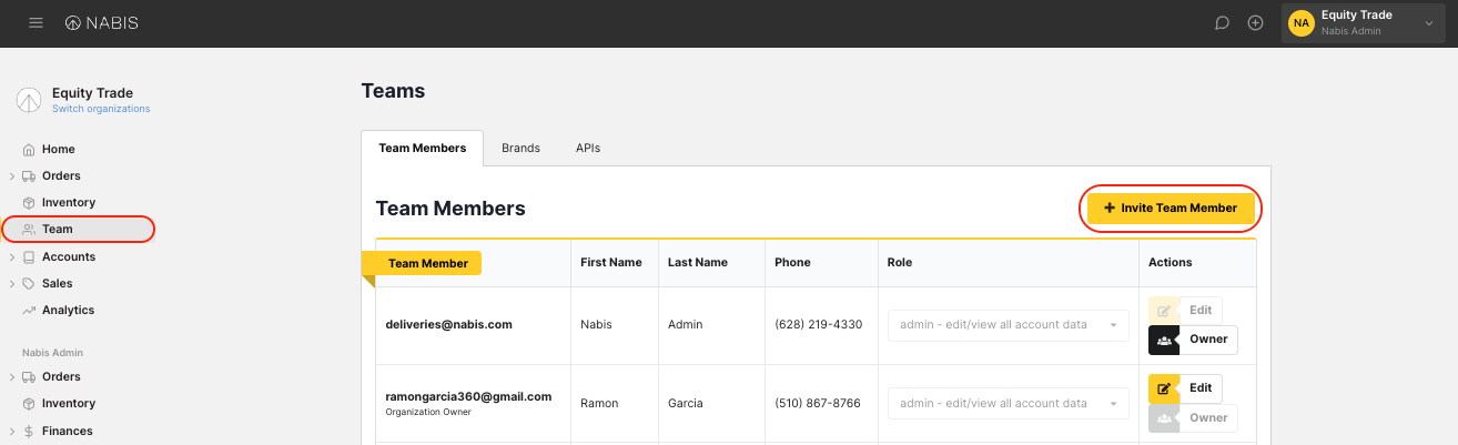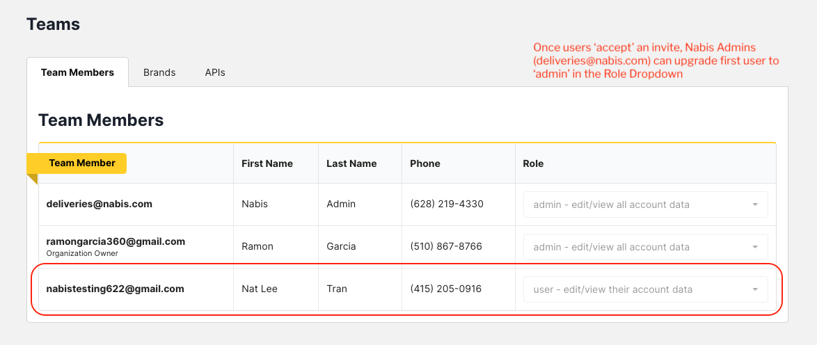 By default, new users will be added as Sales Rep team ‘Users’. For the first invite, a Nabis Admin will need to upgrade this user to an ‘Admin’ in order for that user to have full privileges.