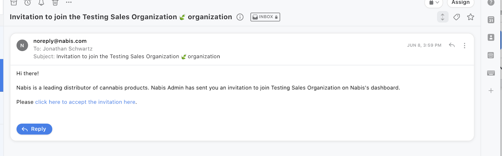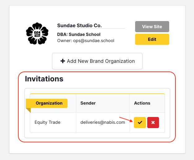 Note: If the email address already has an associated account, once invited, the user can simply log in to Nabis at the ‘My Organizations’ page, or clicking on the Nabis Logo in the upper-left corner, then scroll to the bottom to see ‘pending invites’ to a new Sales Organization.