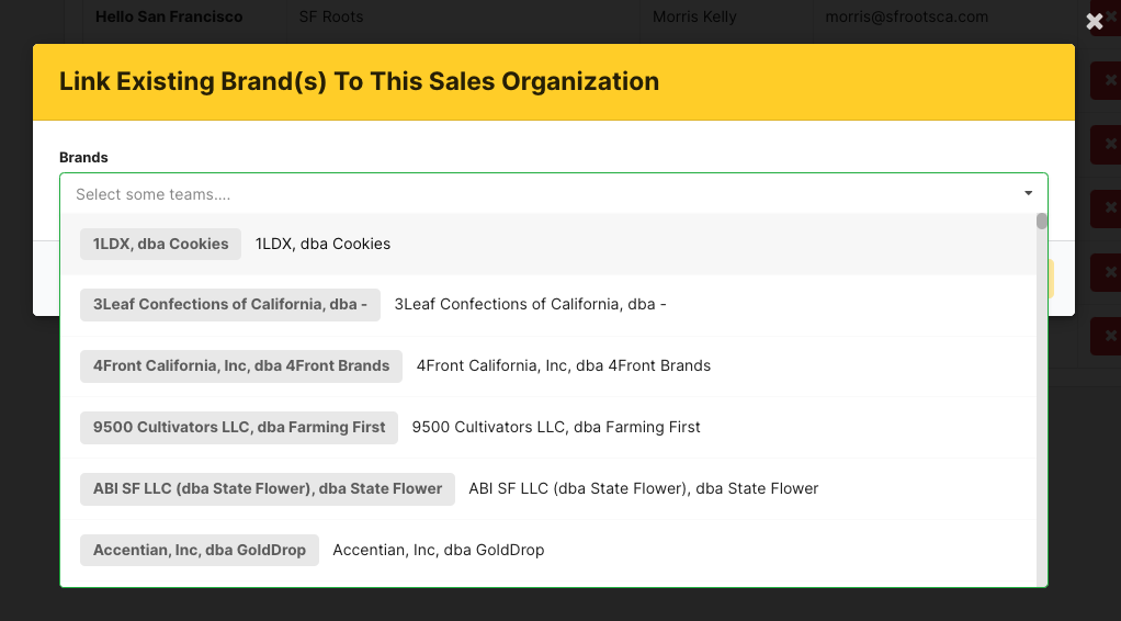 As an Admin (sales agency/brand admin), please navigate to the Sales Organization’s page, then Team → Brands Tab → Add Brands button: