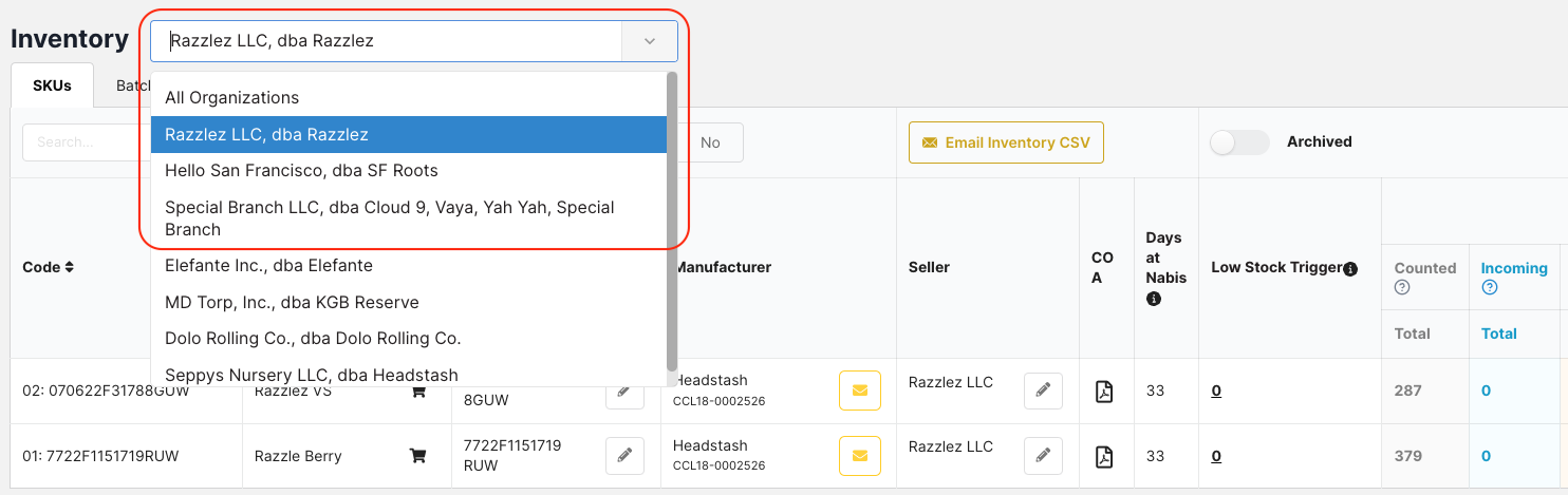 - Sales Admins can navigate to the Inventory Tab → All Organizations dropdown to add/edit inventory for their associated Brands.