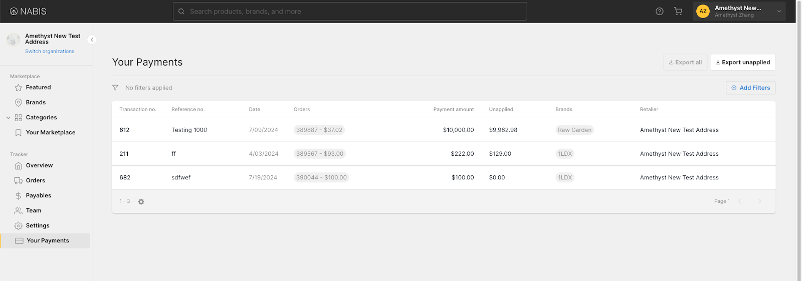 Unapplied Payments: Identify and manage payments that haven't been applied yet, conveniently sorted to the top for your ease of access, based on the unapplied amount of an invoice. To ensure the payments are properly applied to the appropriate invoice, contact help@nabis.com with the reference # and invoice # you want the unapplied payment allocated towards.